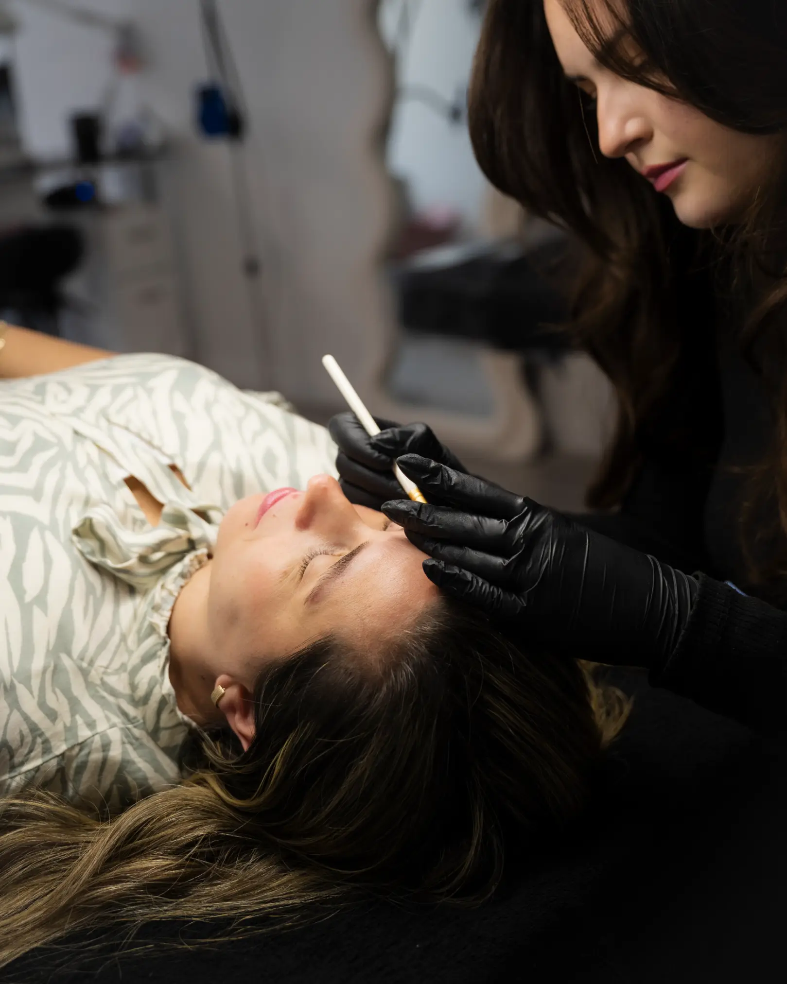 Bij deze behandeling gebruiken we hybrid verf (die haartjes én huid kleurt) in combinatie met een airbrush-systeem. Daarmee sprayen we de verf in fijne, gelijkmatige laagjes op de huid tussen je wenkbrauwen, via vooraf geplaatste malletjes.